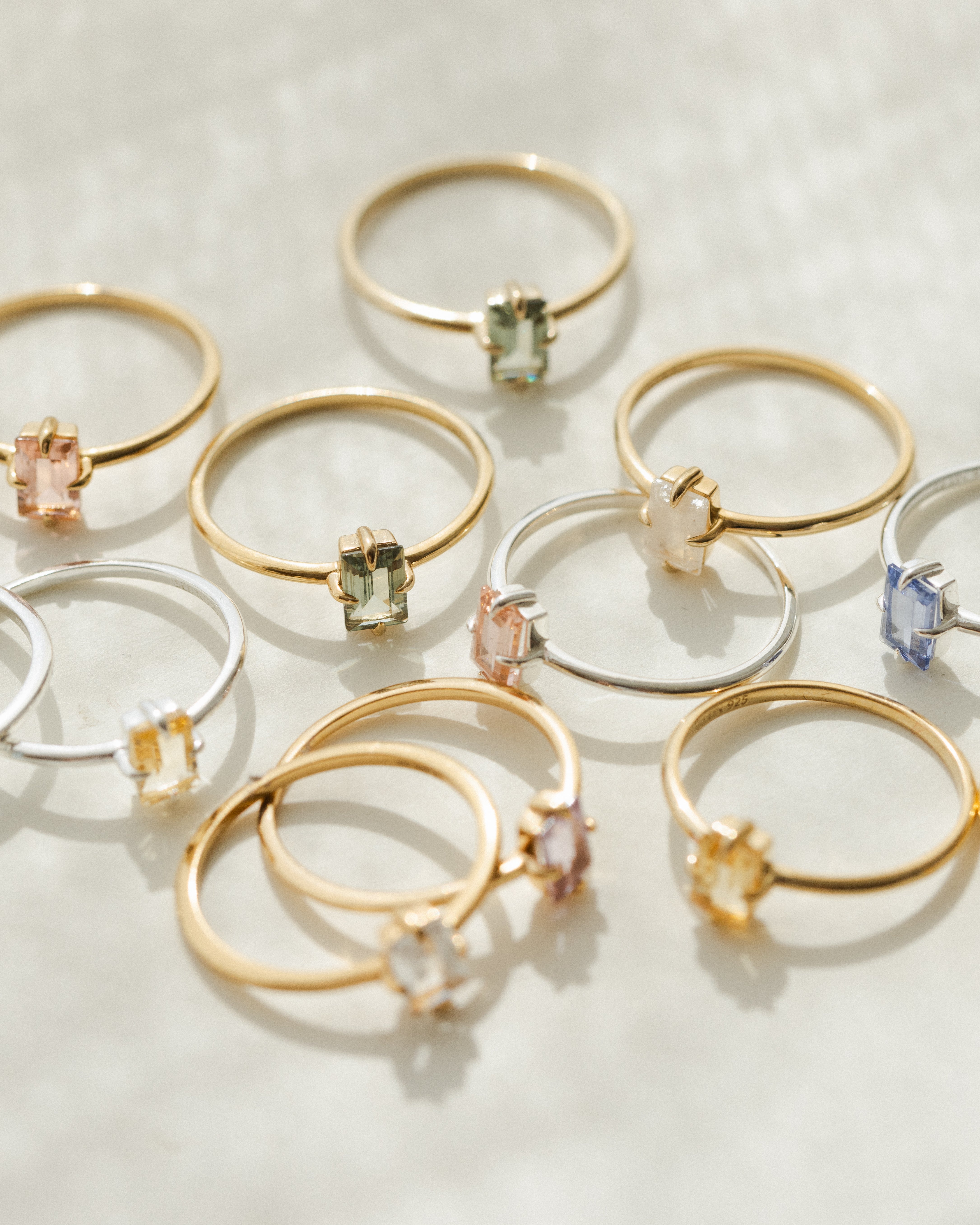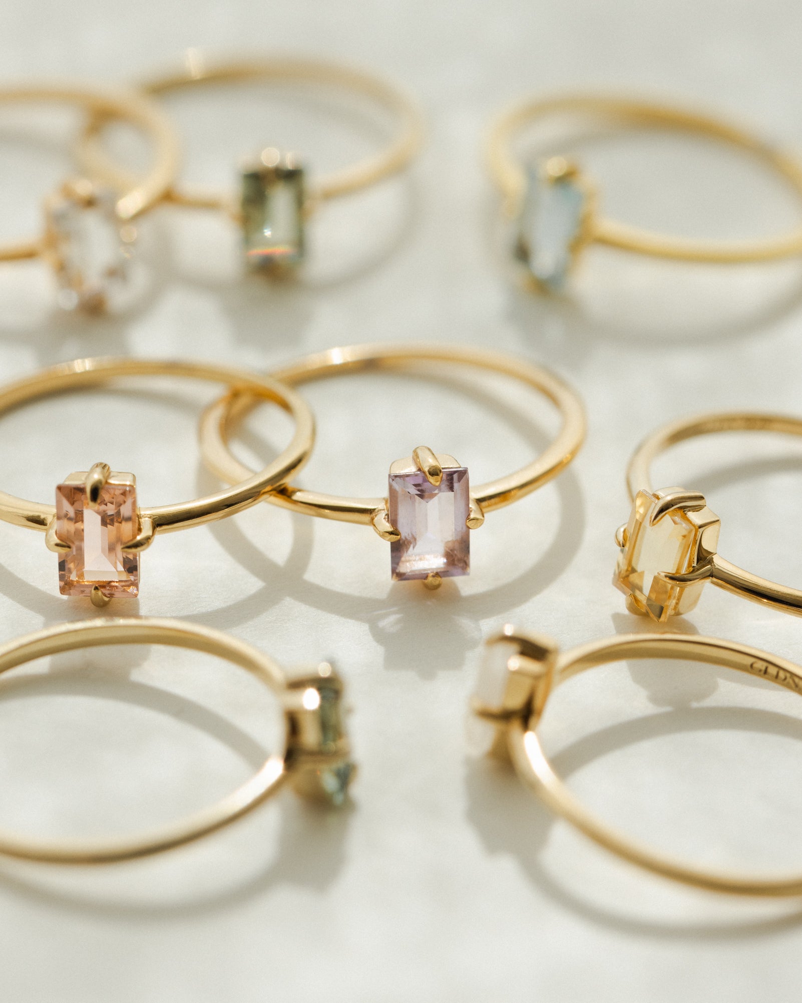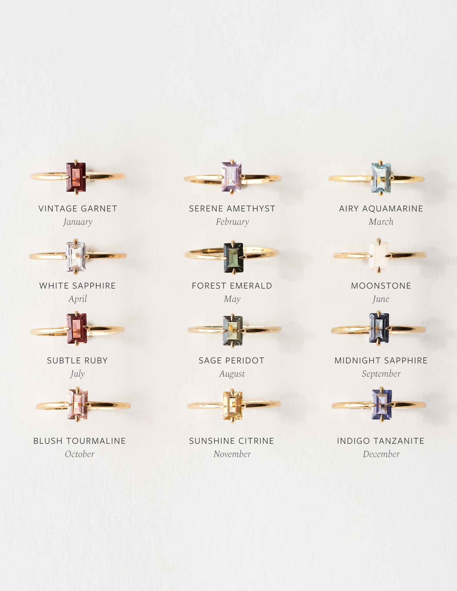 Presenting the full Grand Baguette collection: all 12 birthstone rings set in premium 18k gold vermeil. Shop by birth month, meaning or hue—whichever speaks to you—and pair with the rest of the Aura Birthstone collection. Also available in sterling silver and solid gold.